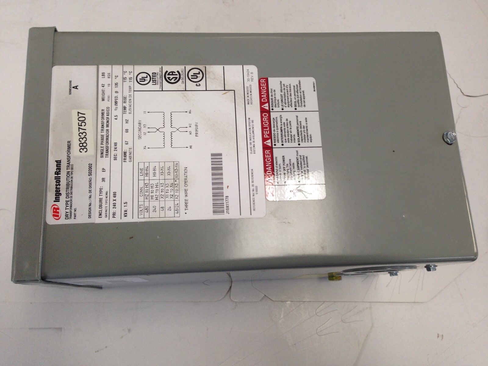 New Ingersoll Rand 38337507 Dry Distribution Transformer,1.5 Kva,240/480 Vac,Dh