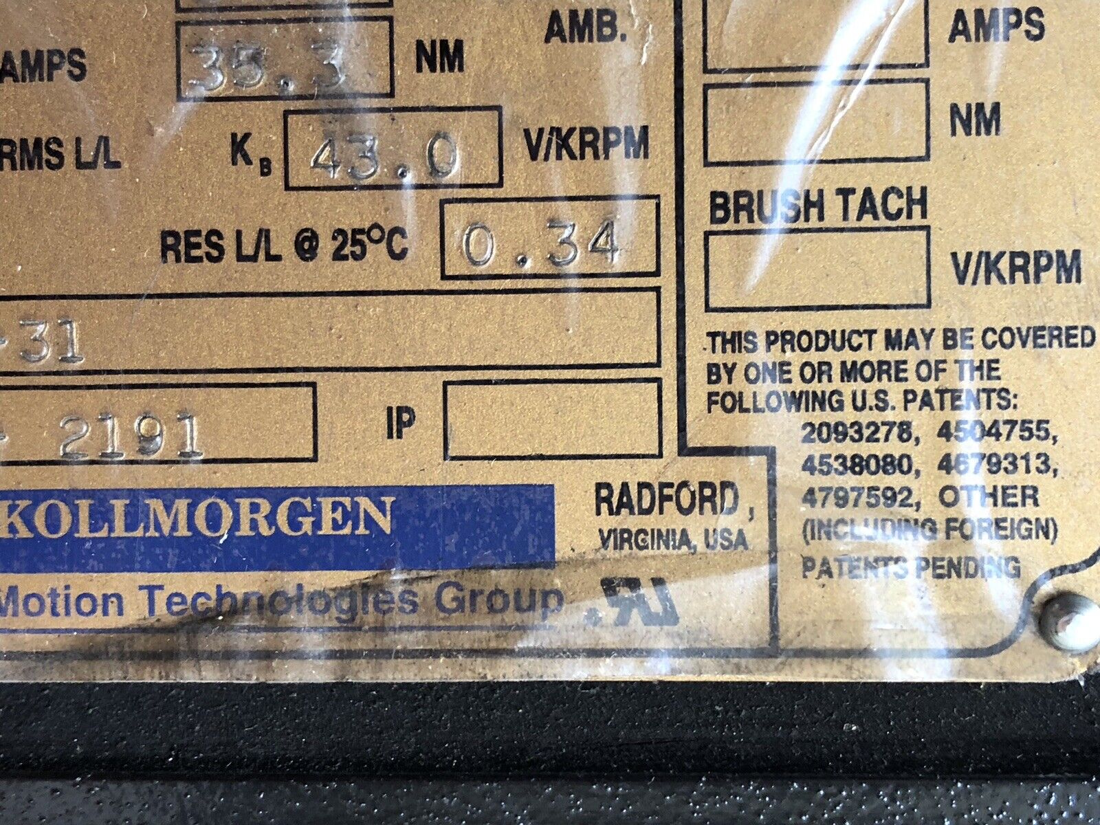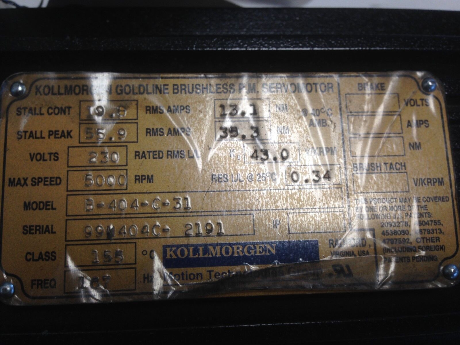 New Kollmorgen B-404-C-31 Goldline Ac Servo Motor, 230 Vac, 5000 Rpm,Th